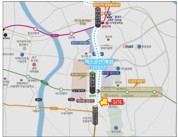 범어동은 대구의 중심 상권과 교육, 행정, 문화 인프라가 밀집된 지역으로, '대구의 대치동'으로 불릴 만큼 우수한 입지를 자랑합니다. 특히, 범어역 라클라쎄는 대구 지하철 2호선 범어역과 3호선 수성구민운동장역이 도보 거리에 위치한 더블역세권으로, 대중교통 이용이 매우 편리합니다. 또한, KTX·SRT 동대구역이 인접해 있어 전국 주요 도시로의 이동도 용이합니다 .