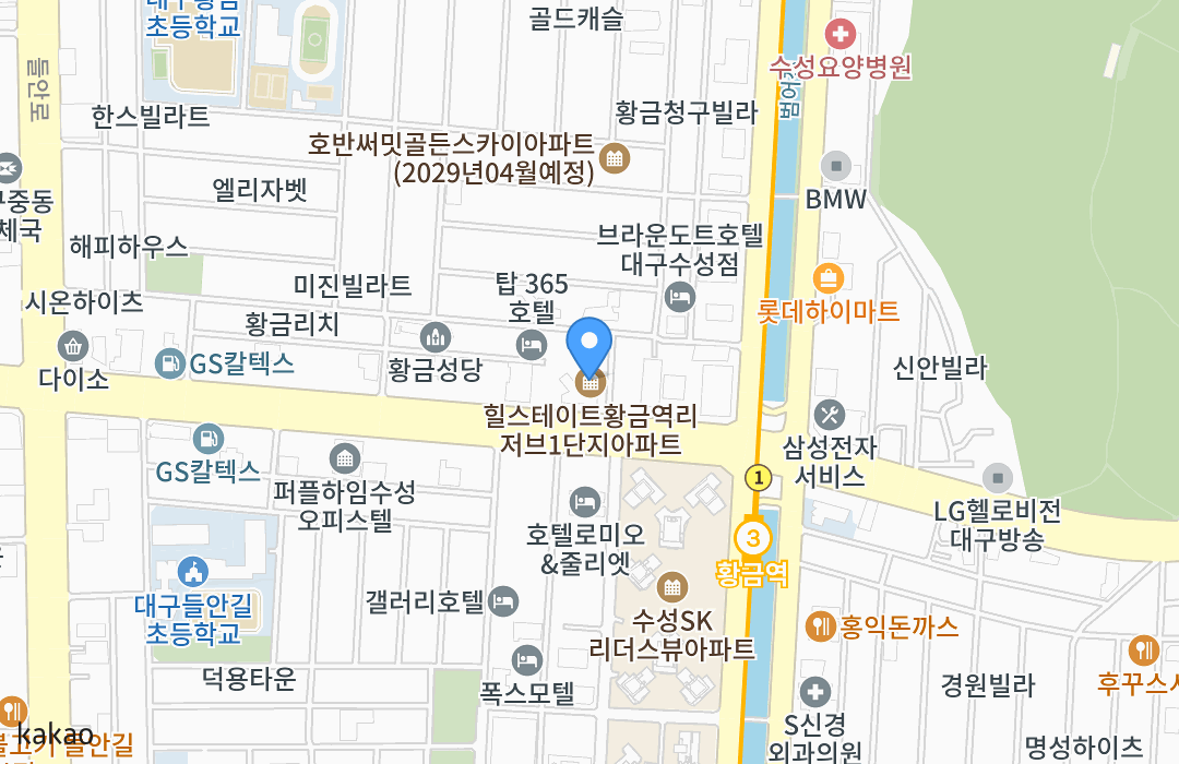 황금역 주변에는 수성SK리더스뷰, 대우트럼프월드아파트 등 고층 아파트 단지가 위치해 있습니다.
